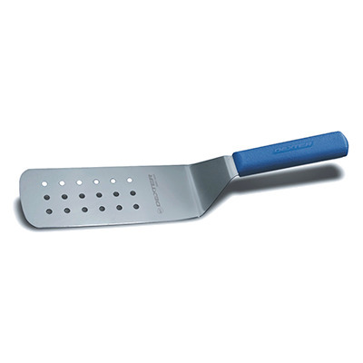 Sani-Safe® (19703C) Perforated Turner, 8" x 3", stainless steel, offset blade, textured, polypropylene blue handle, Perfect Cutlery Packaging, NSF Certified, Made in USA