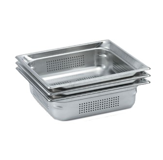 Super Pan 3® Full Size Perforated Food Pan, 6" deep, 150mm, 22 gauge 300 series stainless steel, top flange corners with concave indentation, anti-jamming ramped sides, reverse form flattened edge, framing shoulder, interchanges with SP3 Plastic Pan Line, NSF, meets gastronorm (EN 631-1) standard, USA