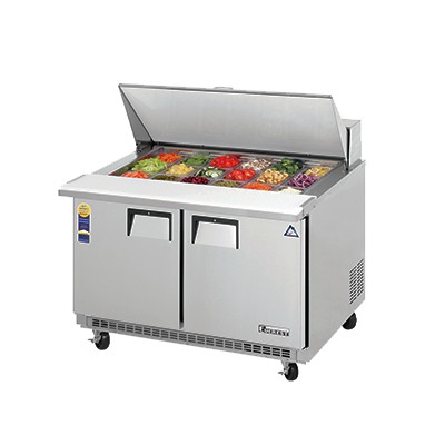 Sandwich Prep Table, Mega-Top, two-section, 11.8 cu. ft. cap., (18) 1/6 PVC top pan cap., (2) shelves, rear mounted refrigeration system, analog thermostat, front air breathing, stainless steel interior & exterior, adjustable self-closing doors, detachable 9-1/8" deep cutting board, (1) 1/2" thick insulated top lid, (4) 4" diameter (5" overall height) swivel casters (front with brakes), 115v/60/1 NEMA 5-15P, 1/4+ HP compressor, 4.11 amps, ETL Safety, ETL-Sanitation