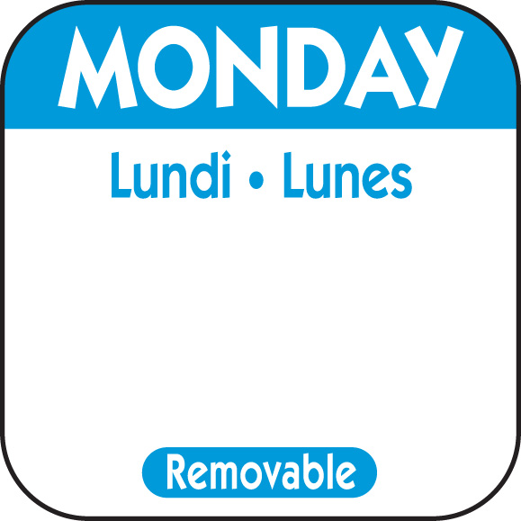 Removable Label: 1 x 1 Trilingual Removable - Monday. 1000 Labels per roll