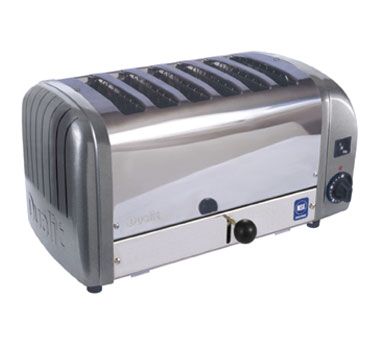 Toaster, pop-up, (6) 1" slots, manual timer control, keep warm feature, manual ejector knob, neon indicator light, pull out crumb tray, ProHeat™ mica elements with 2 year warranty, stainless steel body with metallic grey aluminum end panels, 220v/60/1-ph, 2480 watts, 11.3 amps, NEMA 6-20P, UL, NSF, CSA