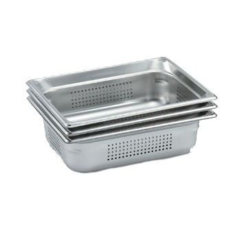 Super Pan 3® Half Size Perforated Food Pan, 2.5" deep, 65mm, 22 gauge 300 series stainless steel, top flange corners with concave indentation, ramped sides, reverse form flattened edge, framing shoulder, interchanges with SP3 Plastic Pan Line, NSF, meets gastronorm (EN 631-1) standard, USA