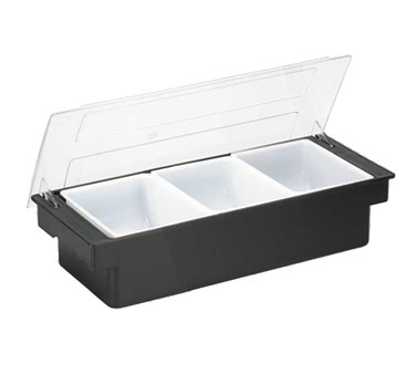 Bar Condiment Holder, 19-1/2" x 6-1/8" x 4-3/8", (3) 1 qt. white inserts, with clear lid, dishwasher safe, ABS plastic, black