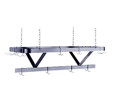 Pot Rack, ceiling hung, triple bar design with ceiling chain hangers, 96" long, with 18 plated double hooks, constructed of 1/4" x 2" stainless steel