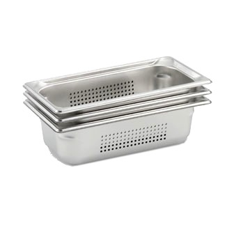 Super Pan 3® Third Size Perforated Food Pan, 2.5" deep, 65mm, 22 gauge 300 series stainless steel, top flange corners with concave indentation, ramped sides, reverse form flattened edge, framing shoulder, interchanges with SP3 Plastic Pan Line, NSF, meets gastronorm (EN 631-1) standard, USA