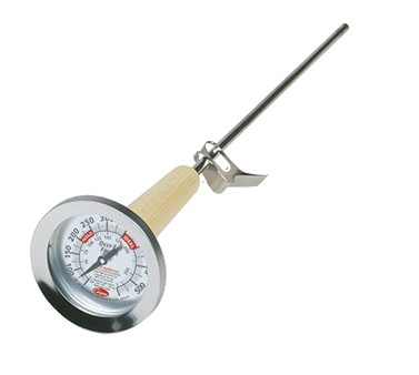 Deep Fry/Tank/Kettle Thermometer, 2.5" dial type with 15" stem with vessel clip and wooden safety handle, temperature range 50 to 550° F, features specific applications and HACCP guidelines