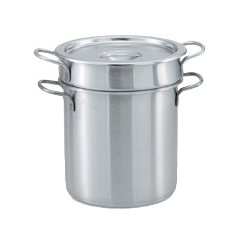Double Boiler, 7 qt., 18-8 stainless, complete with 7-1/2 qt, pot with welded loop handles, 7 qt, inset with round bottom and flat solid cover with strap handle, inset outside diameter 9-3/8" x 8-7/8" deep, insert & pot height 11", NSF, USA made