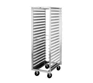 Tray Rack, mobile, end load, single section, pass-thru, 21-1/2"W x 69-1/4"H, 29"D, pass-thru, open sides with slides for (40) 14" x 18" or (20) 18" x 26" pans, slides on 3" centers, riveted aluminum construction, NSF