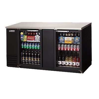 Back Bar Refrigerator, two-section, 68"W, 24.01 cu. ft. capacity, (800) 12 oz. can or (504) 12 oz. bottle capacity, (2) glass doors, (4) shelves, side mounted refrigeration system, textured & laminated black vinyl exterior, stainless steel countertop, galvanized steel interior wall & stainless steel floor, door locks, shielded LED interior lighting (from 2015 model), 115v/60/1-ph, NEMA 5-15P, 1/4 HP, 4.50 amps, ETL Safety, ETL-Sanitation