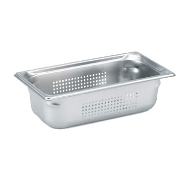 Super Pan 3® Third Size Perforated Food Pan, 4" deep, 100mm, 22 gauge 300 series stainless steel, top flange corners with concave indentation, anti-jamming, ramped sides, reverse form flattened edge, framing shoulder, interchanges with SP3 Plastic Pan Line, NSF, meets gastronorm (EN 631-1) standard, USA