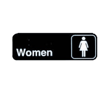 Sign, 3" x 9", "Women", white on black, pressure sensitive adhesive backing