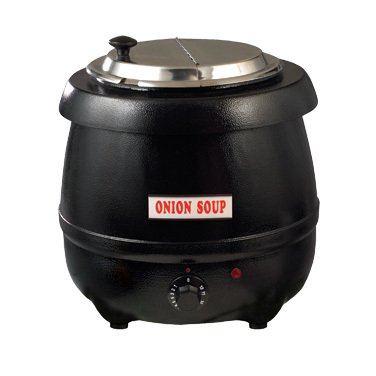 Soup Warmer, electric, 10 quart, 13-3/16" dia. x 15"H, adjustable heat control, stainless steel hinged no-drip lid, removable 18/10 stainless steel bain marie inner pot, double wall construction, with magnetic label holder & assortment of pre-printed soup labels, black, 120v/60/1-ph, 3.3 amp, 400 watts, ETL-Sanitation, cETLus