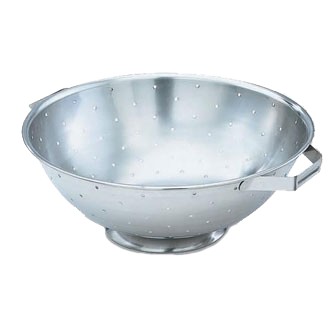 Colander, 5 qt., stainless w/side handles, footed base, 12" dia., 5" deep, Imported