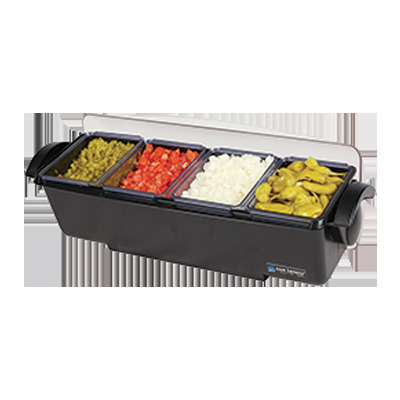 The Dome® Condiment Center, 22"L x 7-1/2"W x 8-1/2"H, 12 pint capacity, holds (4) 3 pint deep trays, (2) handles (included), semi-transparent polycarbonate domed cover, black polycarbonate base, NSF