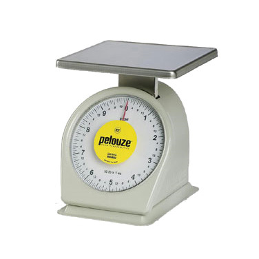 Pelouze® by Rubbermaid Scale, portion, dial type, top loading counter model, fixed dial, shatter resistant yellow color-coded lens, 10 lb. x 1 oz. graduation, powder coated steel housing & stainless steel removable platform with drip rail serves as handle, rinse-through washable design, NSF
