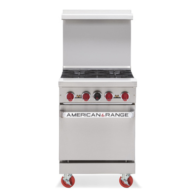 Heavy Duty Restaurant Range, gas, 24", (4) 32,000 BTU open burners, (1) 20" space saver oven, (1) rack, stainless steel front, sides & high shelf, 6" adjustable chrome plated legs, 46.0 kW, 155,000 BTU, ETL-Sanitation, NSF