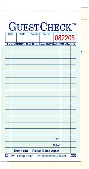 Duplicate paper, carbonless green GUESTCHECK(3.40" x 6.75") has 17 lines with a Menu Prompt for better service. The kitchen copy is unlined and printed on yellow paper. A wrap-around cover prevents write-through. 50 sets per book / 50 books per case.