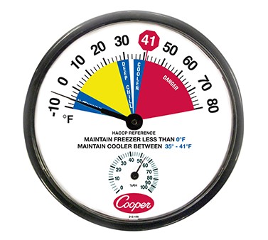 Freezer/Cooler Thermometer, 12" (30.5cm) dia. dial, temperature range -10° to 80°F, ±2°F temp. accuracy, features HACCP reference color zone, 0% to 100% relative humitity, 1 year warranty