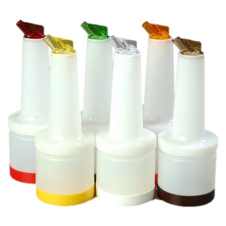 Store 'N Pour® Pint Complete, 16 oz., container, neck, and color-coordinated spout and cap, break resistant, dishwasher safe, polyethylene, assorted colors (priced per each, packed 2 of each color: clear, yellow, brown, orange, red and green, must order multiples of 12), BPA Free