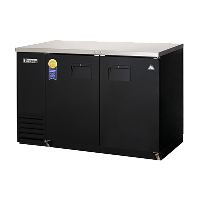 Back Bar Refrigerator, two-section, 49"W, 13.95 cu. ft. capacity, (420) 12 oz. can or (294) 12 oz. bottle capacity, (2) solid doors, (4) shelves, side mounted refrigeration system, textured & laminated black vinyl exterior, stainless steel countertop, galvanized steel interior wall & stainless steel floor, door locks, LED interior lighting (from 2015 model), 1/4 HP, 115v/60/1-ph, 3.50 amps, NEMA 5-15P, NSF, ETL-Sanitation