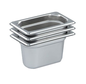 Super Pan 3® Ninth Size Food Pan, 2.5" deep, 65mm, 22 gauge 300 series stainless steel, top flange corners with concave indentation, reverse form flattened edge, framing shoulder, interchangeable with SP3 plastic pan line, NSF, meets gastronorm (EN 631-1) standard, USA
