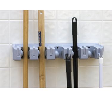 Roll N Grip™ Plus Broom/Brush Holder, 16-1/2"L x 5"W x 3-1/2"H, lightweight, wall-mount, rubber grip, integral fold-up hanging hooks, screws, anchors and template for drilling mounting holes are included, ABS-plastic, light blue