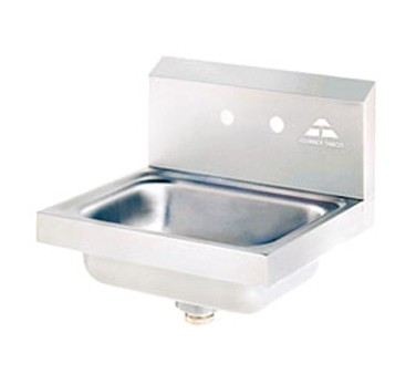 Hand Sink, wall model, 14" wide x 10" front-to-back x 5" deep bowl, 20 gauge stainless steel construction, double splash faucet holes (no faucets), basket drain, wall bracket