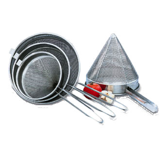 China Cap, coarse mesh, with bowl clip, 12" diameter x 12" deep x 10" handle, 3/32" perforations, stainless steel, permanently welded handle, convenient bowl clip, imported