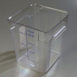 StorPlus Food Storage Container, 18 quart, square, reinforced stacking lugs, secure easy-grip handles with drain holes, date indicators, color-coded capacity indicators, dishwasher safe, textured non-slip finish, polycarbonate, clear, NSF