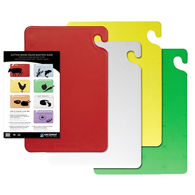 Cut-N-Carry® Cutting Board Set, includes (4) 12" x 18" x 1/2" boards (1 each yellow, red, green, white) & 1 wall chart, food safety hook, NSF