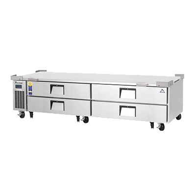 Chef Base Refrigerator, two-section, 95-1/2" wide, (12) full pan size cap., (4) drawers, (8) stainless steel pan dividers, side mounted refrigeration system, digital control system, dual air chaimber & vents, high heat insulation tech-mat, stainless steel grips for unit mobility, worktop security corner guards, stainless steel interior & exterior, heavy duty stainless steel drawer frames, low friction drawer roller slides, (6) 4" diameter (5" overall height) swivel casters (front with brakes), (3) additional front legs, removable detergent-safe air filter, 115v/60/1, NEMA 5-15P, 1/3 HP, 6.0 amps, ETL Safety, ETL-Sanitation