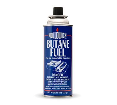Butane Fuel, 8 oz. canister, UL listed to include any Hollowick Series stove, burns up to 2 hours high heat and up to 4 hours at simmer (12 each per case)