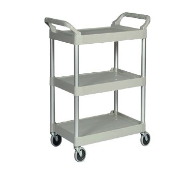 Utility cart with 4'' swivel casters. Brushed aluminum uprights. 200 lb weight capacity. Versatile, functional cart for easy transport. Quiet casters and plastic construction help reduce noise.