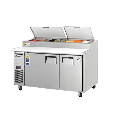 Pizza Prep Table, two-section, 15 cu. ft cap., (7) 1/3 PVC top pan cap., (4) shelves, side mounted refrigeration system, digital control system, stainless steel interior & exterior, (2) 1/2" thick insulated top lids, adjustable self-closing door, 19 1/4" slide-out cutting board, (4) 4" diameter (5" overall height) swivel casters (front with brakes), removable detergent-safe air filter, 115v/60/1, NEMA 5-15P, 1/3 HP compressor, 6.30 amps, ETL Safety, ETL-Sanitation