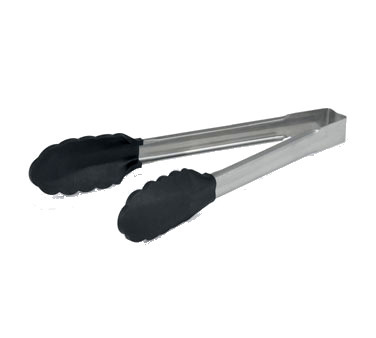 Utility Tongs, one-piece, 9-1/2" long, heavy gauge stainless with high temperature black nylon ends, heat resistant up to 450°F (232°C), dishwasher safe, Made in USA