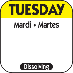 Dissolving Label: 1 x 1 Trilingual Dissolvable - Tuesday. 1000 Labels per roll