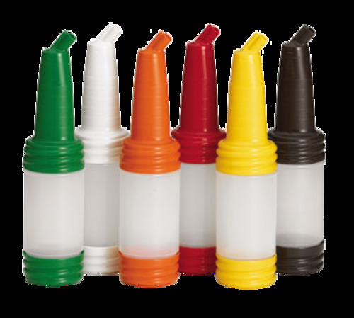 PourMaster® Complete Unit, quart, assorted color-coded caps, 2 of each color: brown, green, red, orange, white & yellow, includes: container, PourMaster® Long Neck Top™ & StorMaster™ cap, dishwasher safe, polyethylene, NSF