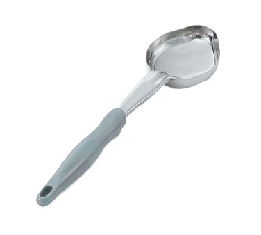 Spoodle®, 1-piece heavy duty, solid oval bowl, handle coded gray, 4 oz.(118ML), 18/8 304 stainless steel, ergonomic design high temperature textured nylon handle heat resistant to 450°F (232°C), built-in stopper notch, cap. stamped on shaft, 13-13/16" overall L, 13-11/16"L bowl diameter, limited warranty, NSF, Imported, Jacobs Pride Collection