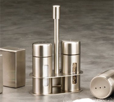 Salt & Pepper Shaker Set w/Base, 3-1/4"H, round, 18/8 stainless steel