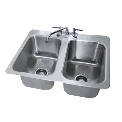 Drop-In Sink, 2 compartment, 10" wide x 14" front-to-back x 10" deep each/bowl, 20 gauge stainless steel, deck mounted 8" swing spout faucet, basket drain