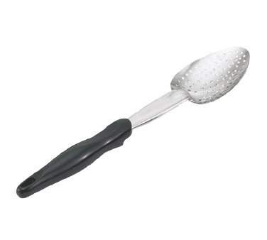 Heavy Duty Spoon w/black nylon ergonomic handle, equipped with Agion®-nature's Antimicrobial protection, perforated, 13-13/16", heavy gauge 18/8 s/s, high temp. handle heat resistant to 450°F (232°C), textured surface handle w/built in stopper notch, lifetime warranty, Imported NSF, Jacobs Pride Collection