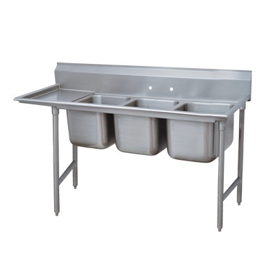 Regaline Sink, three compartment, w/left-hand drainboard, 20" front-to-back x 20" W compartment, 12" deep, with 8" high splash, s/s open frame base, side crossrails, 16/304 stainless steel, 24" drainboard, overall 27" F/B x 95" L/R