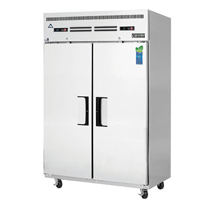 Reach-In Dual Temperature Refrigerator/Freezer Combo, two-section, 49-5/8"W, 22.0 (R) & 22.0 (F) cu. ft. capacity, self-contained top mounted refrigeration, (2) solid hinged self-closing field reversible doors (locking), (6) epoxy coated wire shelves, height adjustable clips, digital controls with LED display, auto defrost, LED interior lighting, pressure relief port, stainless steel interior, stainless steel sides, galvanized steel top, bottom & rear, (4) 5" swivel casters (2 locking), R290 Hydrocarbon refrigerant, dual 1/4 HP (R) & 1/2 HP (F) compressors, 115v/60/1-ph, 9.0 amps, cord, NEMA 5-15P, NSF, cETLus, ETL-Sanitation
