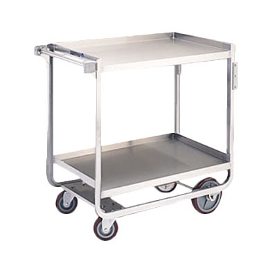 Tough Transport® Utility Cart, 2-tier, 39"W x 22-3/4"D x 37-3/8"H, stainless steel construction, open base U-frame with angled stainless steel, 21" x 33" 14-gauge shelves with reinforced edges, 21" shelf clearance, 1" O.D. tube push handle with bumpers, (2) 6" bumpers riveted to front legs, 1000 lb. capacity, (2) 5" reinforced swivel plate casters & (2) 8" fixed casters with non-marking polyurethane wheels, NSF, Made in USA