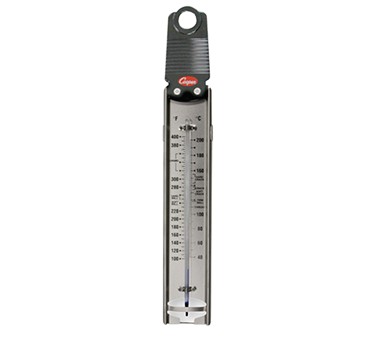 Deep Fry/Confectionery Thermometer, paddle type, 12-1/2" (31.7cm), with s/s black plastic handle and non-toxic spirit-filled glass tube, temperature range 100 to 400°F (40 to 200°C) ±2°F/ 1°C temperature range