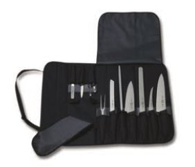 Cutlery Roll Set, 7-piece set includes: 3-1/4" spear point paring knife (#40600), 6" boning knife (#40513), 8" chef's knife (#40520), 10" granton slicer (#40633), 9" offset wavy bread knife (#40550), 9" steel (#40687), & black polyester roll bag, high carbon stainless steel blades, Fibrox® Pro handles, black