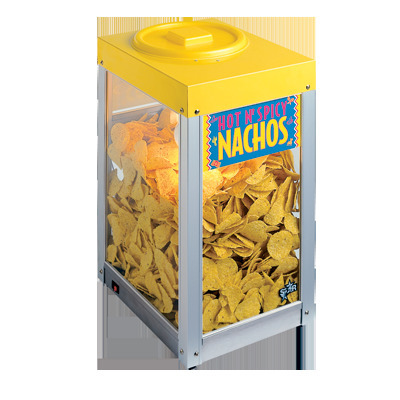 Nacho Chip/Popcorn Merchandiser, 12"Lx15"Dx23"H, approximately 7 lb. capacity, top loading with rear dispensing door, heated interior with display light, aluminum/stainless steel frame, tempered glass panels, includes: nachos & popcorn signs, 125 watts, NSF, UL, CSA