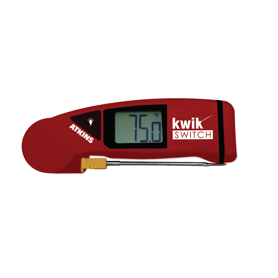 KwikSwitch Folding Thermocouple Kit, digital, 3-3/4" replaceable probe, Type K, -40°F to 500°F (-40°C to 260°C) temperature range, ±1°F temperature accuracy, large backlit LCD with 3/4" digits, 0.1 resolution, 0.5 second display update rate, induction compatible, easy on/off by flipping probe open/closed, auto off after 10 minutes, low battery indicator, IPX7 waterproof rated, ABS plastic housing, red, operates with (2) AAA batteries, NSF, CE