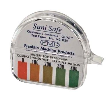 Sani Safe Quaternary Ammonia Compounds "QUAT" Test Kit, quality litmus paper, 5/32" x 15' roll with color-coded test chart, strips can be torn off at any length