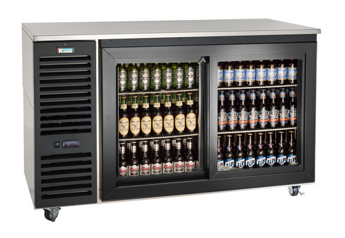 Sliding Door Refrigerated Back Bar Storage Cabinet, two-section, 60"W x 24"D, side mounted self-contained refrigeration, 30°-40°F temperature range, (2) sliding glass doors, (2) adjustable shelves & floor rack per door, LED interior lights, includes condensate evaporator pan, black vinyl front, stainless steel interior, R134a, 1/4 HP, 115v/60/1-ph, 6.0 amps, NEMA 5-15P, ETL-Sanitation